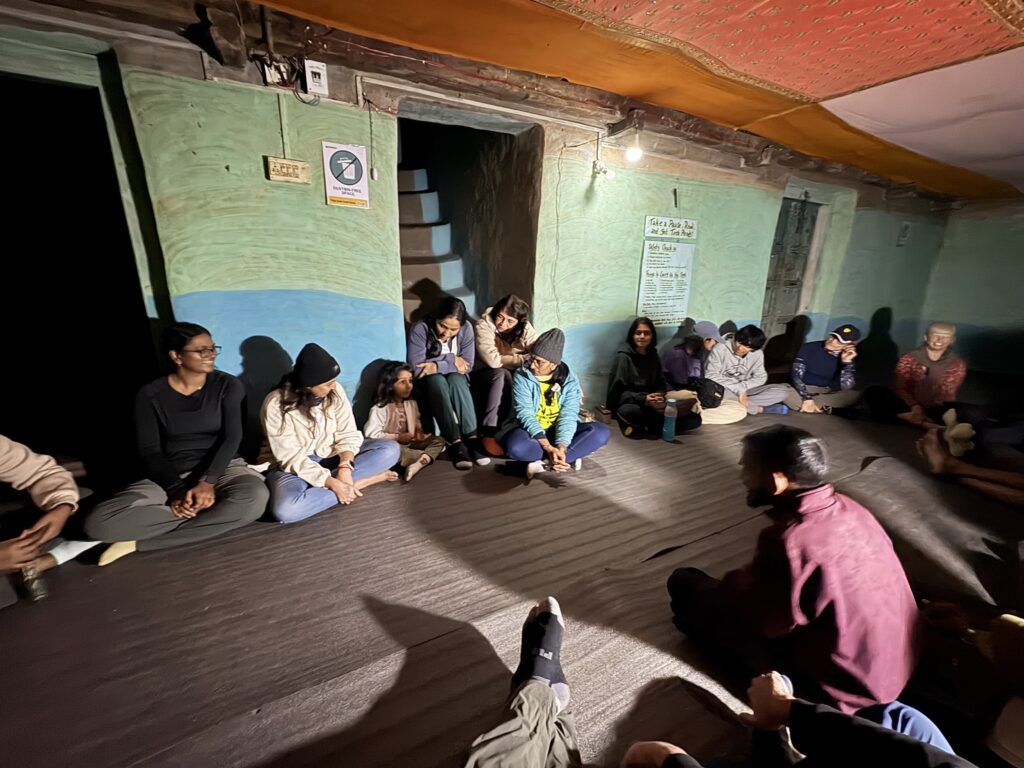 Once final preparations were complete and everyone was settled, we went on a sunset walk around the small village of roughly 150 inhabitants. We gazed out at the forests and hills we would be trekking through over the next three days and enjoyed the peace and tranquillity of the village, with its baby goats, dogs, and curious locals. After a dinner of simple, hearty Indian food, our team of 23 trekkers, along with our lead guide and two assistants, gathered cross-legged in a circle in the main room of the house. We went around the circle, each of us taking a turn to introduce ourselves and share our backgrounds and interests. Our team was largely comprised of Indians from various parts of the country, along with a couple from the UK, a lady from Japan, and three people originally from India who currently reside in the USA. Our party ranged in age from six to seventy-eight, with the bulk of us in the over-40 category. Soon after, it was into our sleeping bags and off to sleep for a good start the next morning.