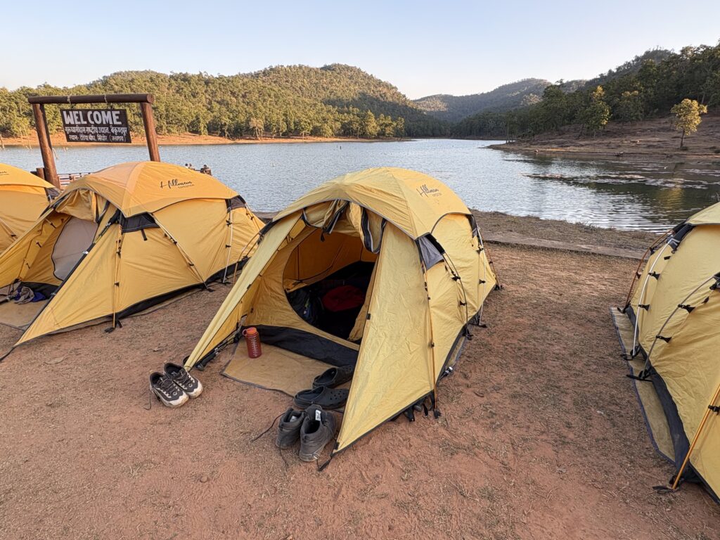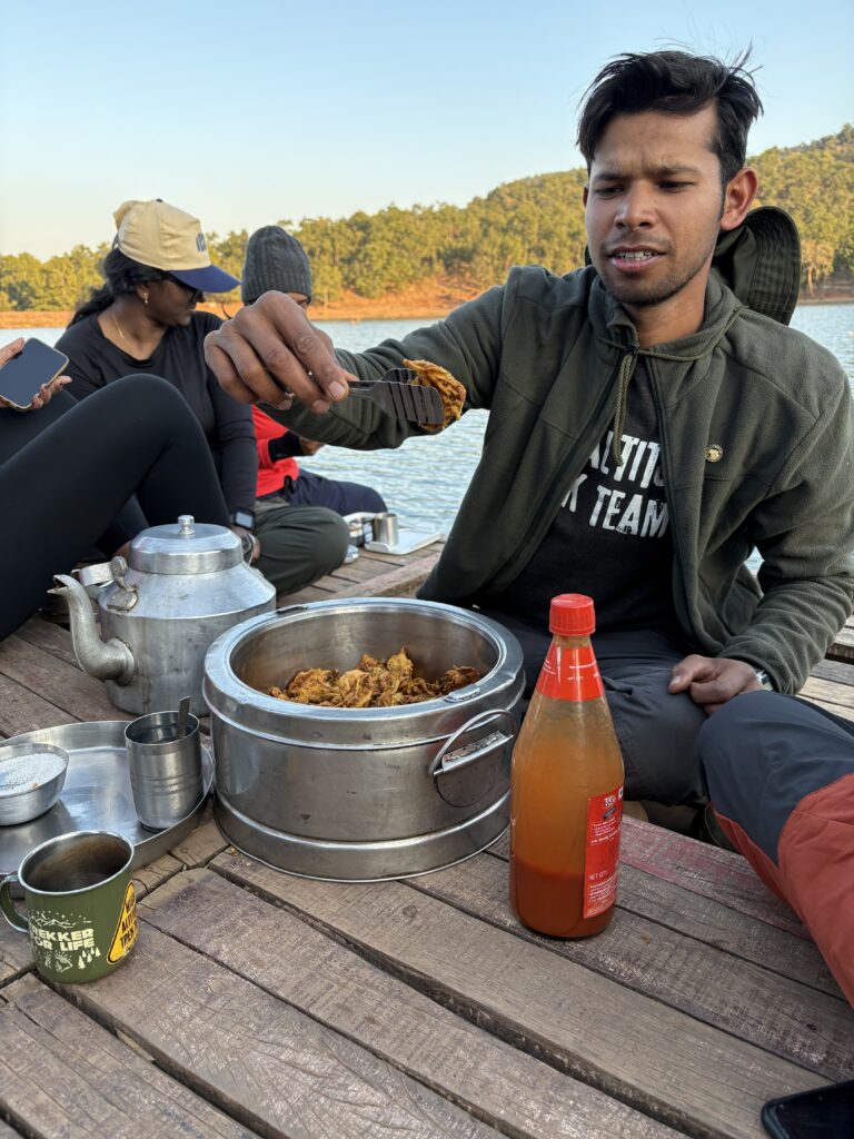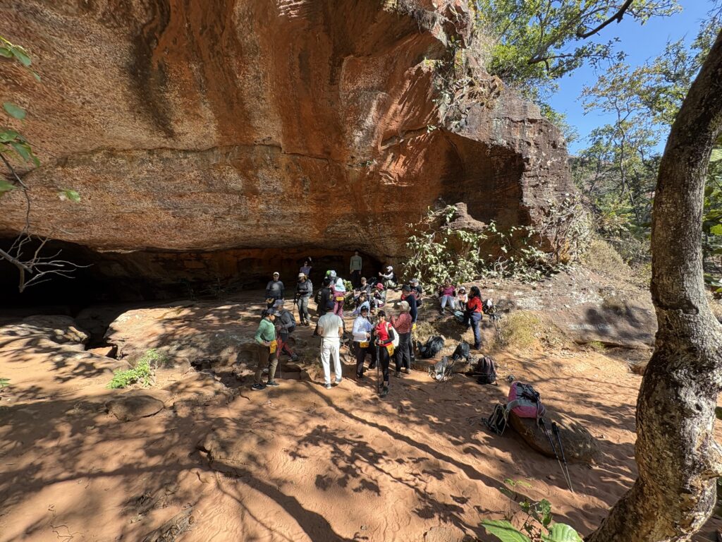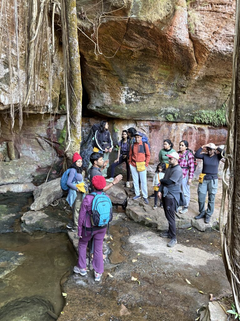 As we trekked through forest dominated by sal trees, we slowly began to get to know the various members of our team as we chatted and assisted one another whenever required. The highlight of the day was reaching a large cave of stunning reddish rock, through which a small stream flowed and exited about 150 feet away on the other side. While the cave itself was impressive, it was the estimated 10,000-year-old prehistoric art that truly stole the show. The artwork depicts humans, animals, and geometric forms that have not yet been investigated by the Archaeological Survey of India. After rehydrating and having some snacks, we continued the trek. Along the way, our guides shared information about local plants and wildlife, including tree markings and hair from a sloth bear, as well as tasting some samples of a local medicinal plant used to treat malaria, fevers, and other ailments. Another major highlight was a stop at a site where indigenous and early Iron Age peoples, beginning around 1500 BCE, collected iron ore to craft various artifacts and tools. As the kilometres unfolded, we eventually descended alongside a small stream to reach the verdant grass at the southern end of Tadiyabaan Lake. After a further 20 minutes of hiking along the lakeshore, we arrived dusty and tired at our campsite.