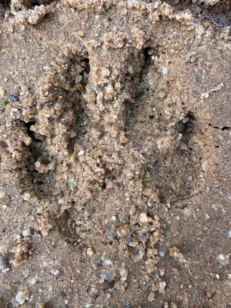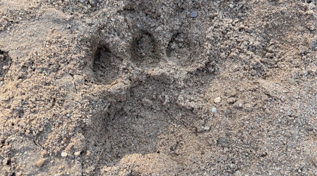 We soon began the meandering descent toward the Gopat River along another small stream. We stopped for a tasty lunch from our tiffin boxes at a pretty spot beside the creek, surrounded by enticing rock formations and large, irregular boulders. A nearby banyan tree, with its vine-like tendrils, soon brought out the inner Tarzan in many of our fellow trekkers—and of course Mylo could not resist. After everyone, young and old, who wished to do so had taken their turn swinging out over the rocky creek bed, we continued the trek. We eventually reached flat ground and, a couple of hundred metres later, emerged on the bank of the Gopat. With a burst of newfound energy, we doffed our shoes and socks and hiked the remaining 500 metres to camp barefoot through the cool, sandy, ankle-deep waters of the river. On a sandbar in the middle of the river, our guides found a tiger print—a vivid reminder that a small but growing population of tigers shared the forest here with us, setting my imagination alight.