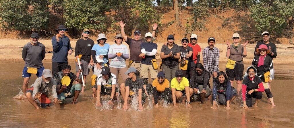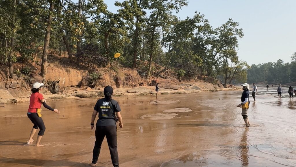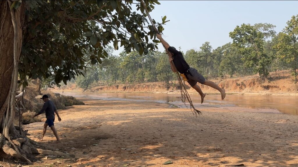 On the final day of our trek, with only five kilometres left to go, we were allowed to sleep in until 7 am instead of our usual 6. After breakfast and tea, and once our gear was assembled, we were delighted by a surprise announcement: today we would leave our packs behind (to be reunited with them later) and continue our ankle-deep march down the Gopat River unburdened. With our previous weariness forgotten, we spent a joyful morning frolicking in the water, playing frisbee as we went, and soon enough tossing one another into the shallow, clear river for a refreshing soak. Along the way, we found a tree growing in the river that immediately sparked a competition to see who could climb the highest. After yet another Tarzan tree was discovered, another friendly contest broke out to swing the farthest or climb the highest. Feeling a little under the weather, I took the opportunity to rest in the shade and do some healing meditation. An hour or so later, we reached our meeting point with the vehicles that would take us back to Turripani village for lunch, to collect our bags and excess luggage, and to begin the long drive back to Raipur, where we would make our final parting of ways.