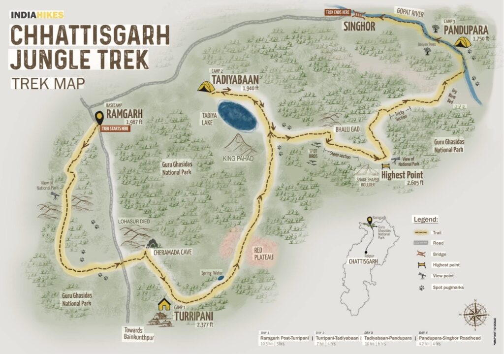 We arrived in Raipur in the early evening and made our final preparations for our early morning rendezvous with our trek organizers, Indiahikes, and our fellow trekkers. The first day would be spent largely in transit, as we needed to travel 365 kilometres north to the small village of Turripani, where our 23-kilometre jungle trek through Guru Ghasidas National Park would begin.