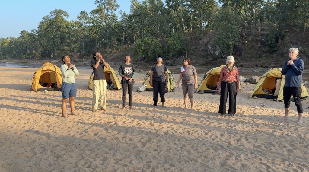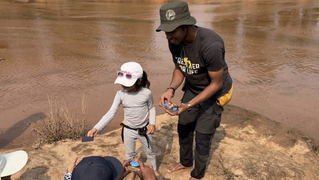 We were up at 6 am for day two of our trek, with 12 kilometres ahead of us before reaching our next camp along the sandy banks and crystal-clear waters of the Gopat River. After tea, breakfast, and our morning warm-up, we followed the opposite side of the lake back to the point we had reached the previous day. From there, we began a steady climb alongside a small stream to reach the high point of the trek. Along the way, we found leopard tracks and spotted a shy, retiring langur monkey. The final scramble led us past “Simba’s Rock,” named after the Lion King, to an awe-inspiring lookout over the surrounding forests and rocky-topped hills. We stopped here for photos and a short break. Just as we were about to depart, a cry of “snake!” rang out, and we quickly gathered around a small tree, trying to locate the reptile camouflaged in the foliage. Eventually, our eyes settled on a tiny green snake about three feet long and pencil-thin. The local guides identified it as a venomous bamboo viper (though further analysis indicates it may be an Indian vine snake – slightly less venomous!) and repeatedly warned us eager photographers to stay back due to its ability to strike forward if threatened.