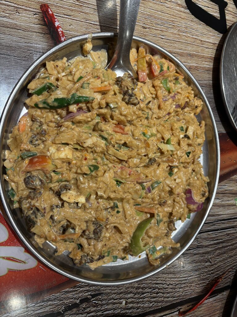 We ordered kottu, widely regarded as Sri Lanka’s ultimate comfort food. Originating as street fare, this vibrant stir-fried dish combines shredded flatbread with vegetables and a choice of meat, all rhythmically chopped together on a hot griddle in a percussive culinary performance. We opted for chicken and cheese, ordered the large portion, and paired it with a mango lassi — a yoghurt-based drink. Despite our considerable hunger, it completely filled my nephew Mylo and me.