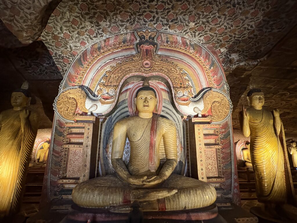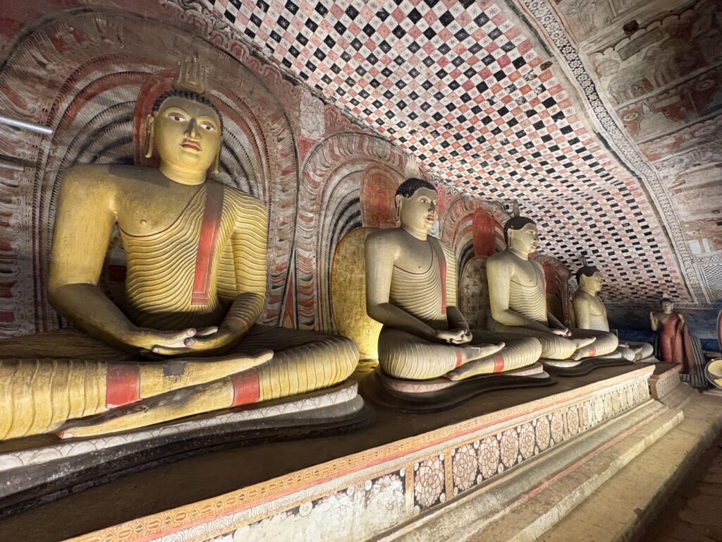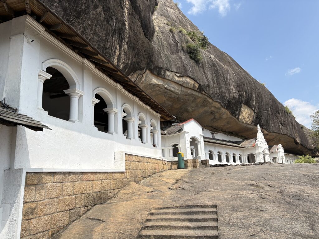 Inhabited since the 3rd century BCE, the caves were converted into a temple in the 1st century BCE by King Valagamba, who had taken refuge there during his exile. Though more than 80 caves exist in the area, we visited the five principal shrines carved beneath a massive overhanging rock. Their interiors are adorned with vivid murals and filled with Buddhist statues, including a 14-metre reclining Buddha carved directly from the rock, its serene expression untouched by the passage of centuries.
