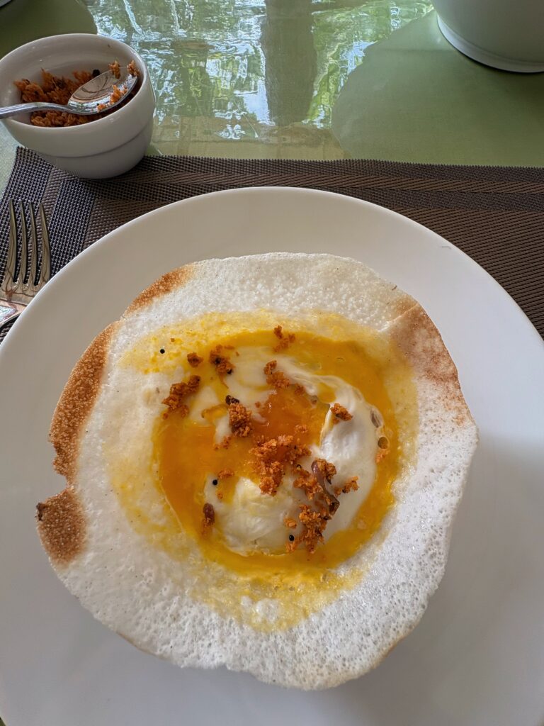 By 9:30 a.m., we were back at our cabana enjoying breakfast, including egg hoppers — bowl-shaped savoury pancakes made from fermented rice flour and coconut milk batter with an egg cooked into the centre, crisp at the edges and soft in the middle.