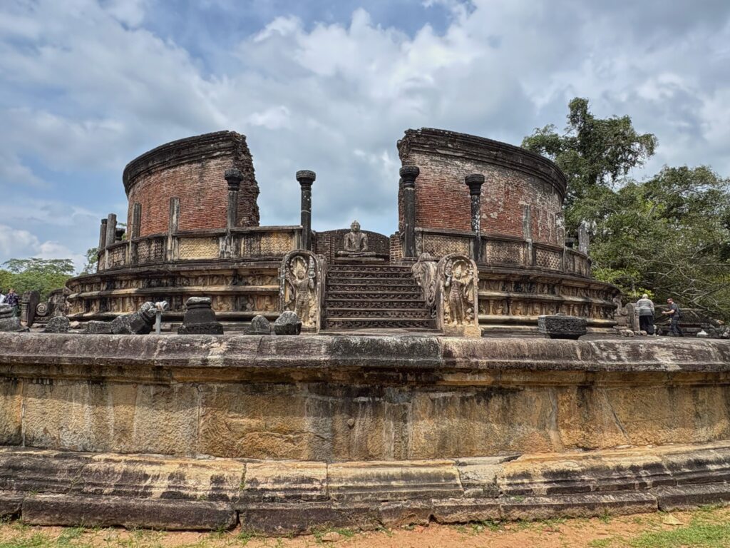 Located about an hour and fifteen minutes east of Sigiriya, Polonnaruwa served as Sri Lanka’s second ancient capital between the 11th and 13th centuries CE. The sprawling ruins occupy a relatively flat landscape and were once celebrated as a “garden city,” sustained by an advanced irrigation network. Along the way, we were fortunate to spot an elephant feeding by the roadside, a quiet, humbling encounter that momentarily stilled us all.