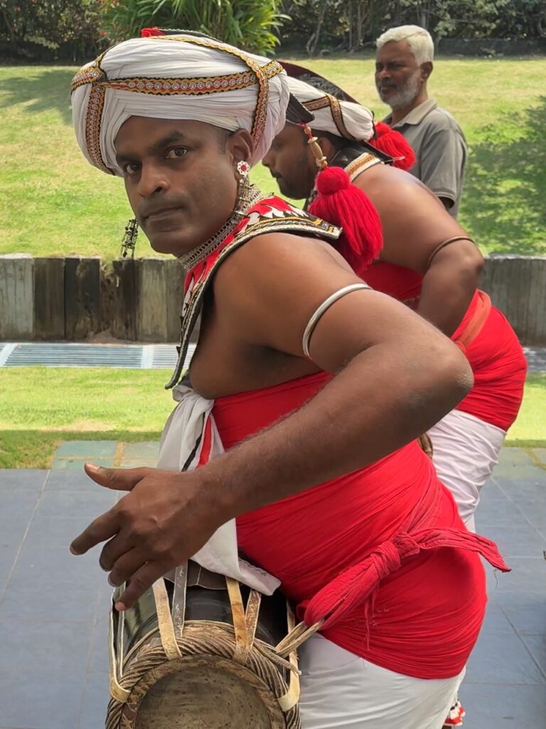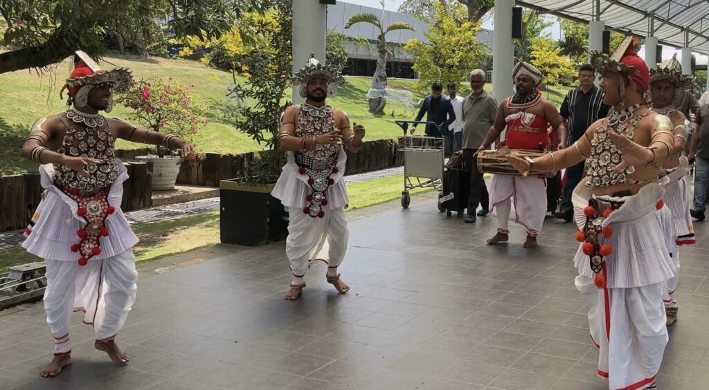 As we waited, the sounds of drumming and singing suddenly rose and swelled behind us. A group of traditional Kandyan dancers and drummers paraded past in full regalia. They often come to the airport to welcome VIPs — which we certainly are not — so we weren’t sure who they were officially there to greet. Nevertheless, we thoroughly enjoyed the spectacle: dancers performing athletic leaps and spins, drummers pounding their double-headed drums with tassels flying, and singers chanting tales of animals and mythological lore that seemed to echo from another era.