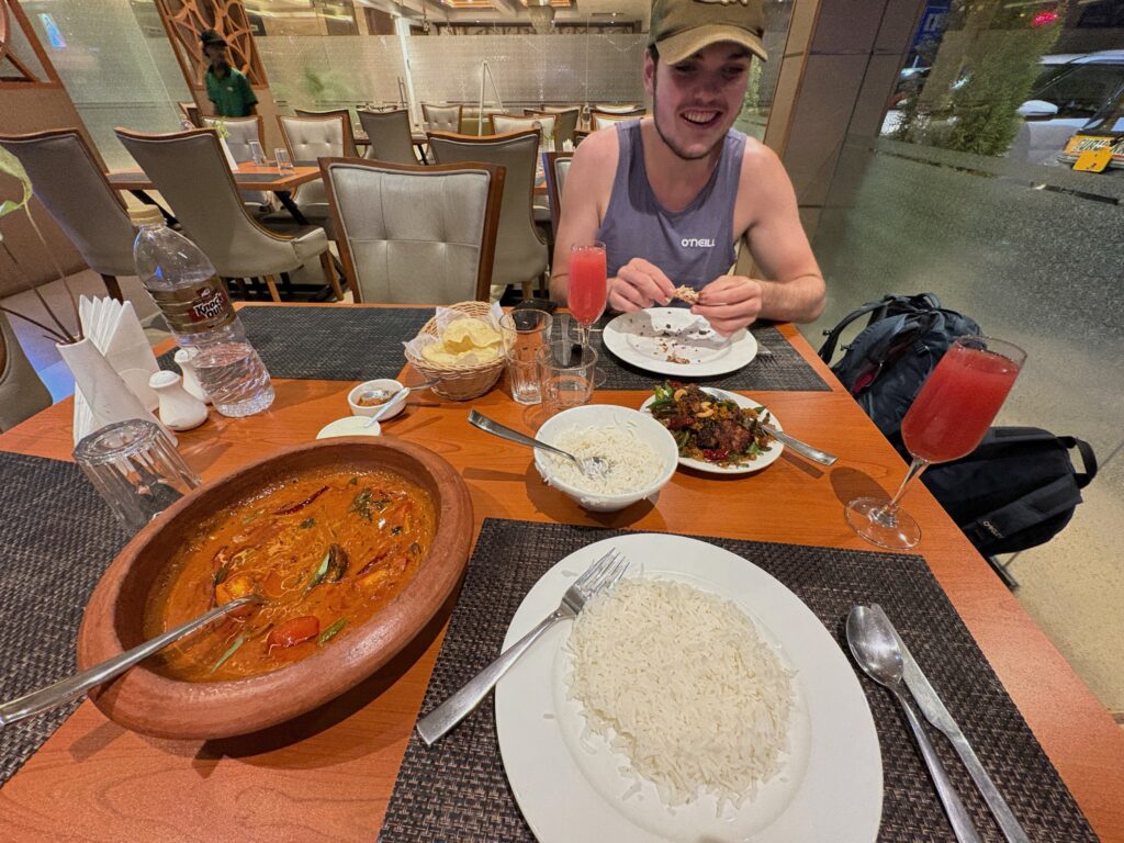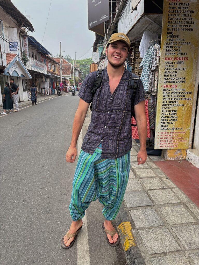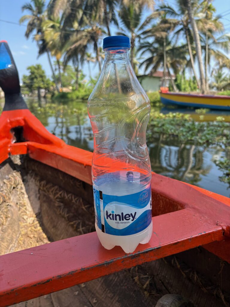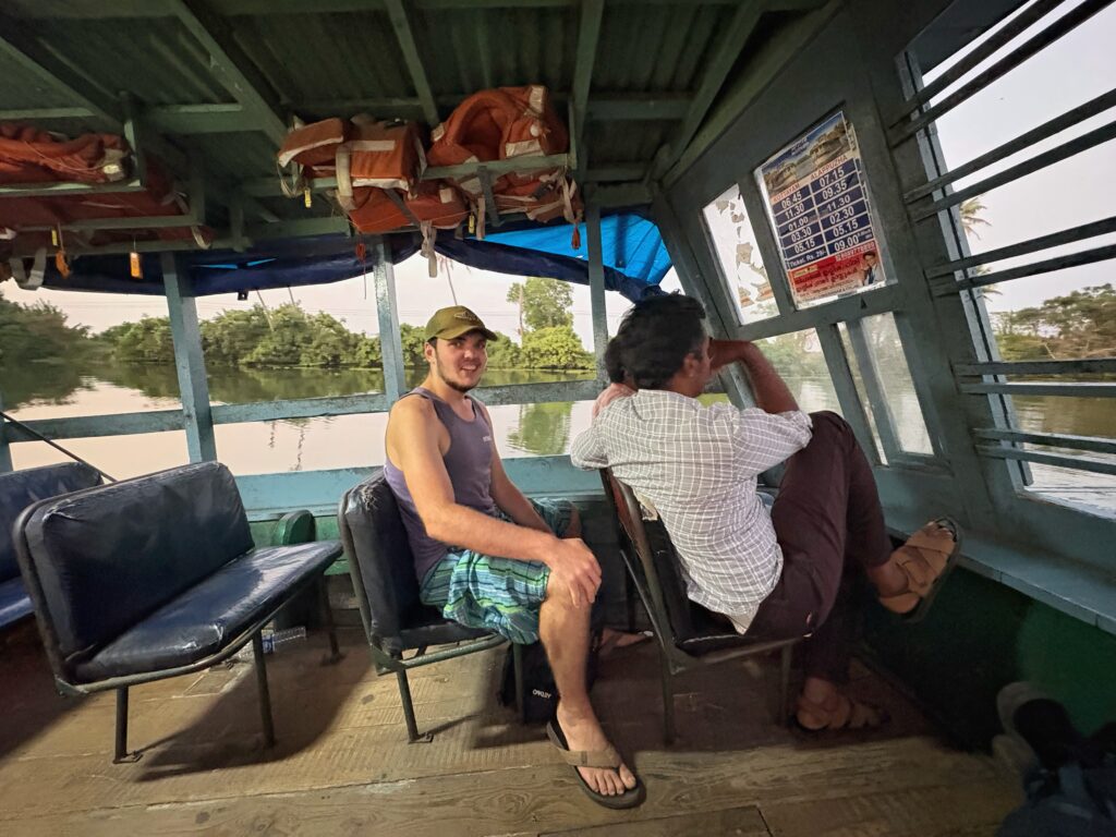 After a simple breakfast the next morning, we headed to Alleppey proper. We met our small group and boarded one of the diesel ferries that serve as the primary transport for locals. After forty minutes of chugging along with many brief stops, we arrived at our destination. We were met by a local who led us to a small home along the canal where we were treated to a simple Indian breakfast (our second of the day!) served on a banana leaf. Afterward, we divided into two small boats and paddled through a network of canals for about three hours. At one point, our guide stopped at a local “toddy” (coconut beer) shop and returned with a recycled water bottle full of the beverage. Mylo, a fellow traveller from Israel, and I shared the sweet, pleasant drink, which only enhanced the tranquility.
