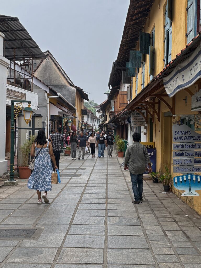 We next wandered a little further to reach Jew Town, a historic narrow street that served as the heart of India’s oldest Jewish community for centuries. Some accounts suggest that the first Jewish merchants arrived in India around the 10th century BCE, with later waves of refugees arriving around 70 CE after the destruction of the Second Temple in Jerusalem. Jew Town itself formed between the 14th and 16th centuries when the Raja of Kochi awarded the community sanctuary and land near his palace as they fled persecution. The Jewish quarter also houses the Paradesi Synagogue, one of the world’s oldest active synagogues.