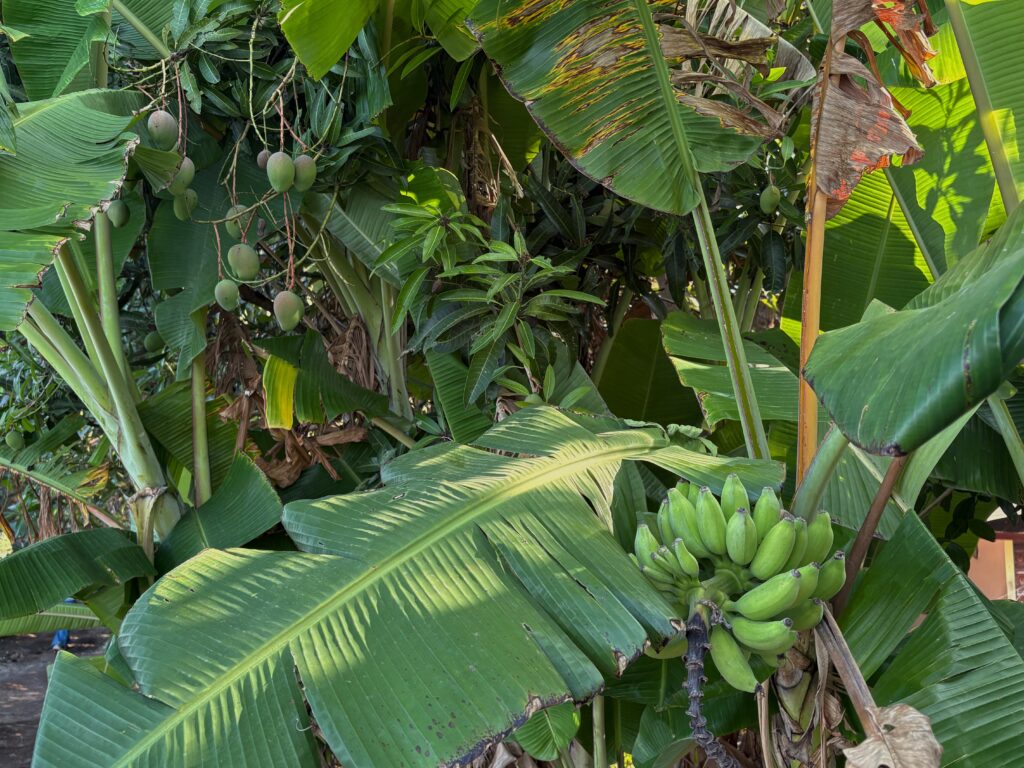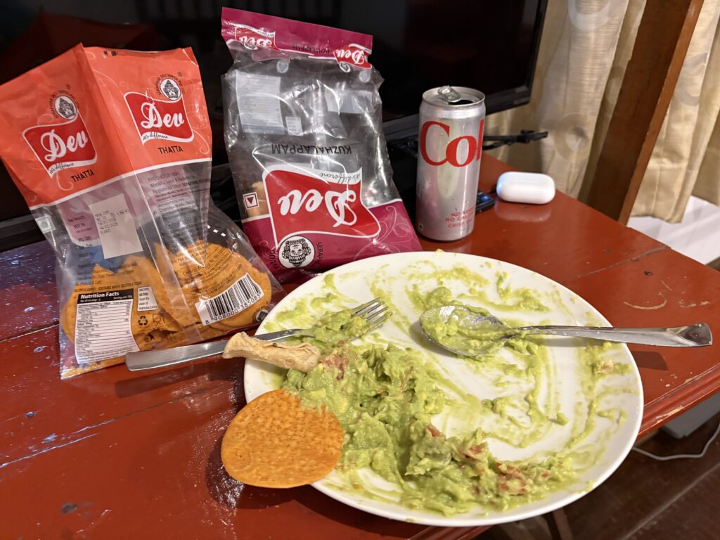On our walk home, we secured all the ingredients we needed for our guacamole, including garlic, tomatoes, and limes. A few of the stands we stopped at lacked the ripeness we were seeking, but eventually, we found a good stall. Here, the three vendors passed the avocados back and forth as they squeezed and assessed them. Once we had narrowed it down to two large, ripe fruits and the “head assessor” had given his approval with a classic Indian head bobble, we were off again. With our hunger building, we also picked up fresh samosas, deep-fried jackfruit, and a recommended “Butter Bun.” Not locating any tortillas, we honed in on two types of Indian chips or crackers: Thatta, a flat, round, crispy disc roughly 2 inches in diameter and often described as a “fried savory cracker”; Kuzhallapam, a tubular, crispy, spiral-shaped snack with a slightly savoury-sweet taste. Both paired perfectly with our guacamole. Without further ado, we mixed up one of the largest and best batches of guacamole ever and thoroughly enjoyed it.