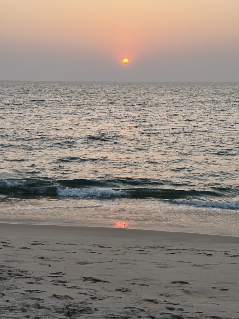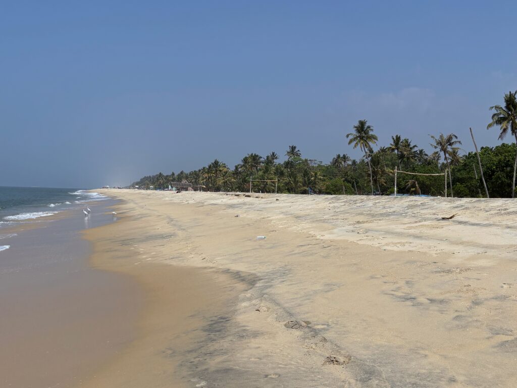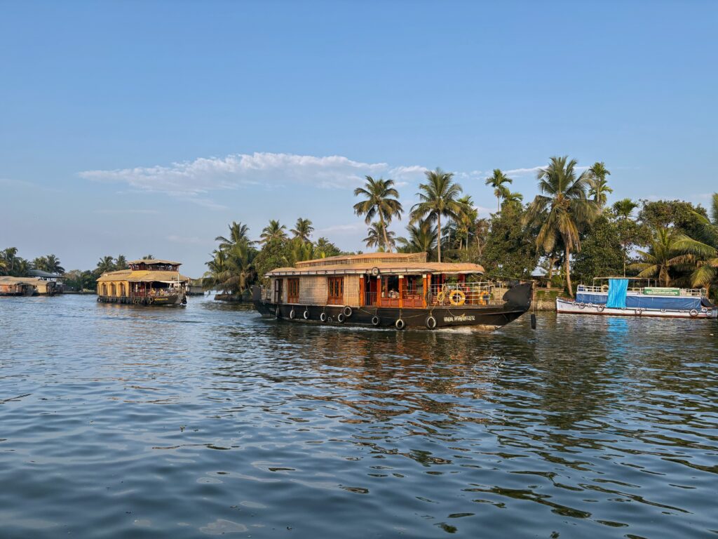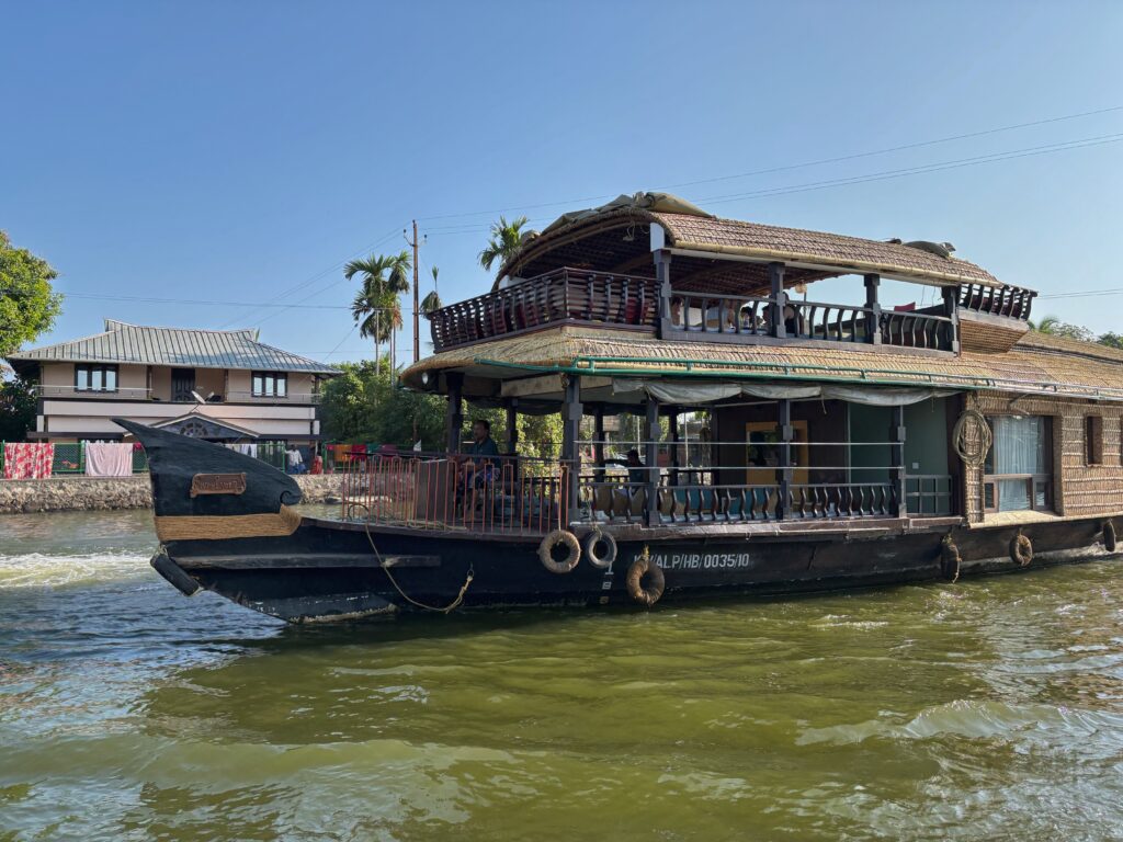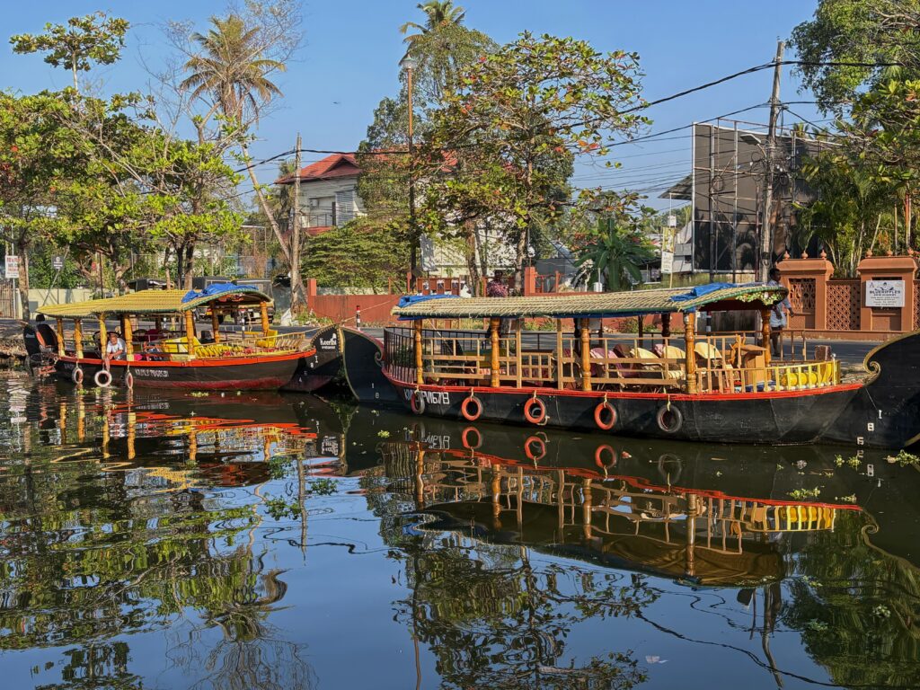 The following morning, we took an Uber south towards one of Kerala’s backwater Meccas, the town of Alleppey. Known as the “Venice of the East,” it boasts over 900 kilometres of interconnected canals, rivers, and lagoons. Today, Alleppey draws many tourists to explore these placid backwaters by houseboat, motorboat, canoe, and kayak. We stayed nearby at Marari Beach in a simple homestay just metres from the water, spending our first day swimming and enjoying seafood and coconut curries.