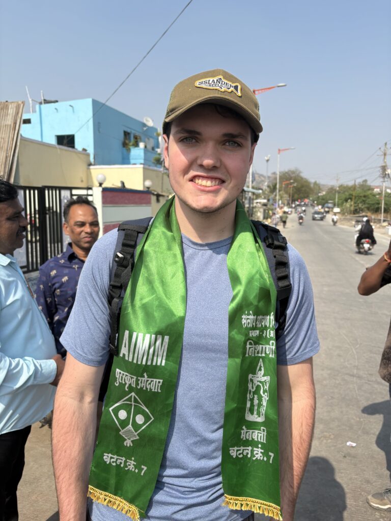 Getting there was its own adventure. With local elections approaching, the streets were filled with flag-waving political processions that repeatedly blocked our Uber. Spotting two foreigners in an auto-rickshaw, one supporter asked us to step out for a photo—standard practice in India. Hoping cooperation would speed our escape, we agreed, only to find ourselves draped in party colors and posing with a local political figure. We were just trying to disentangle ourselves when a rival group appeared and offered some lighthearted ribbing.