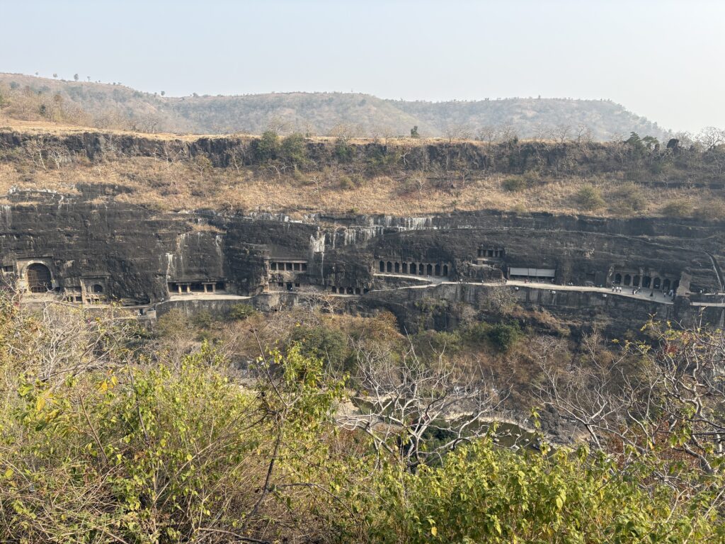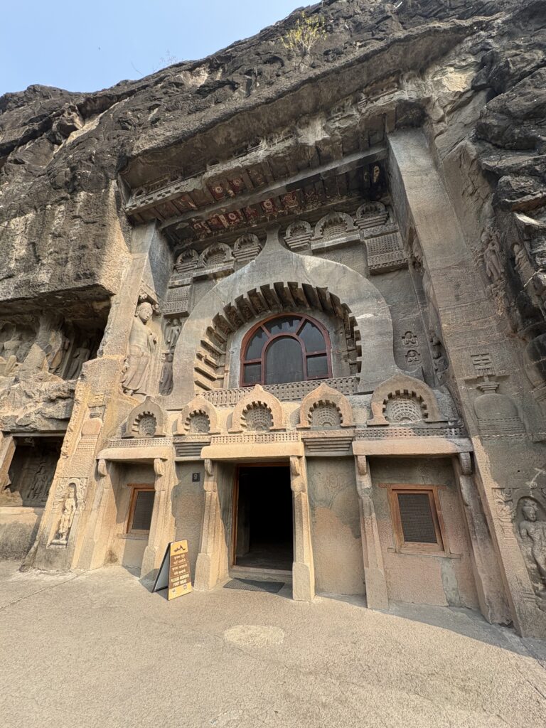 Our introduction came at the Aurangabad Caves, twelve rock-cut Buddhist shrines carved into a hillside on the city’s northern edge. Dating from the 6th to 8th centuries CE, the caves feature intricate Buddhist sculptures, along with the occasional Hindu deity such as Ganesha. Carved entirely from solid rock, they offered an impressive preview of the far more famous cave complexes still to come.