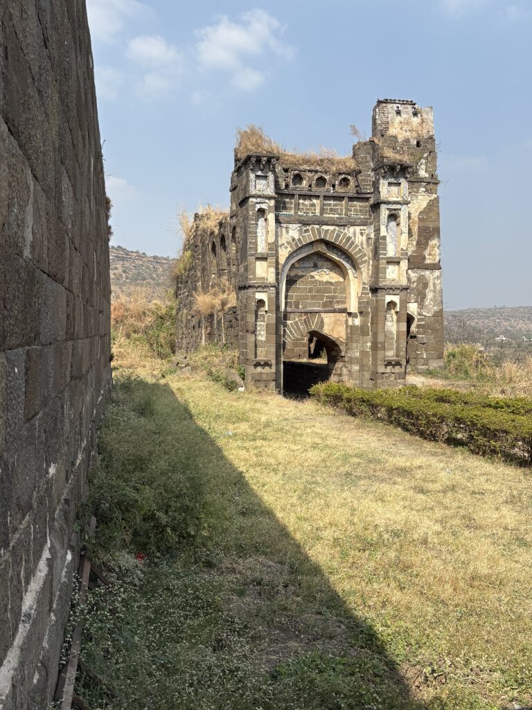 After five punishing hours of climbing in the heat, we refueled with bananas and copious amounts of water before tackling Daulatabad Fort. Built in the 12th century, the hill fort is a masterclass in medieval military engineering. The ascent led us across moats, past spiked elephant-proof gates, through dark, twisting passageways, and up 750 steps to the Baradari, an octagonal palace perched 200 meters above the plains. The reward was a sweeping 360-degree view, a welcome breeze, and the sight of the Chand Minar, a 30-meter Persian-style minaret glowing pink in the late-afternoon sun.