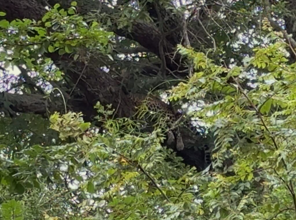 After the morning’s excitement, we headed to the designated coastal rest area for coffee, breakfast, and a bathroom break. The stretch of sand and surf made for a stunning setting — a surreal backdrop for a safari stop. Being on safari in such an idyllic location reminded me of Namibia’s coastal parks, but lush and green instead of stark desert. After the break, wildlife sightings continued, including another leopard in a tree — the closest of the three. We also had another close elephant encounter with a bull intent on inspecting our vehicle for snacks.