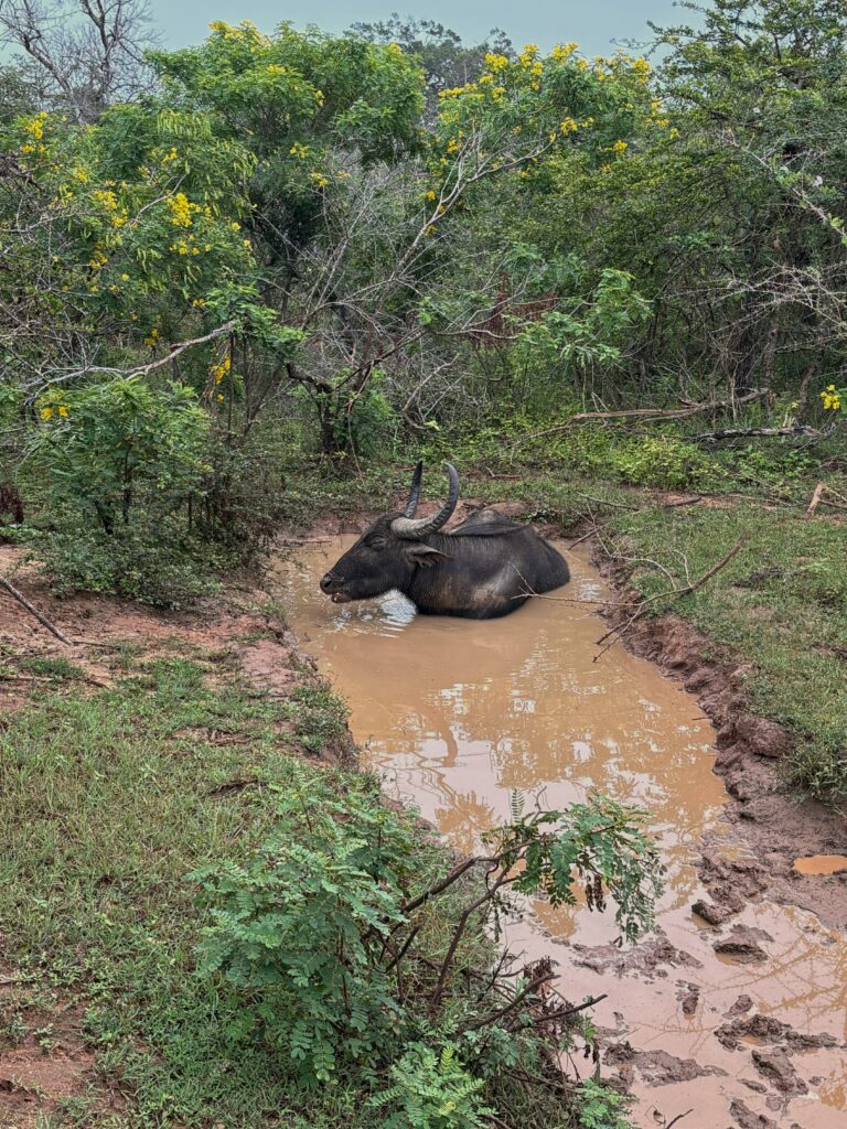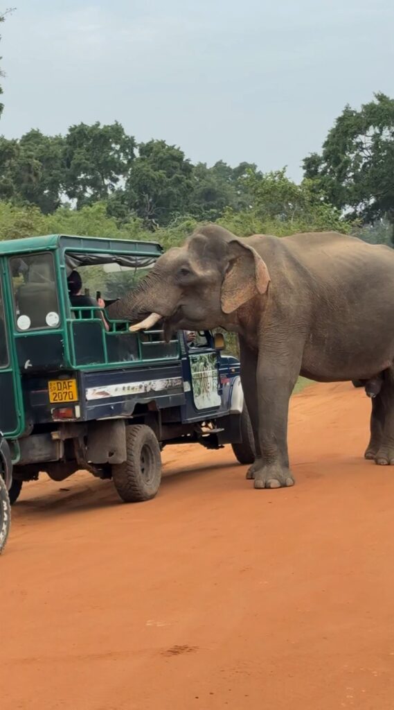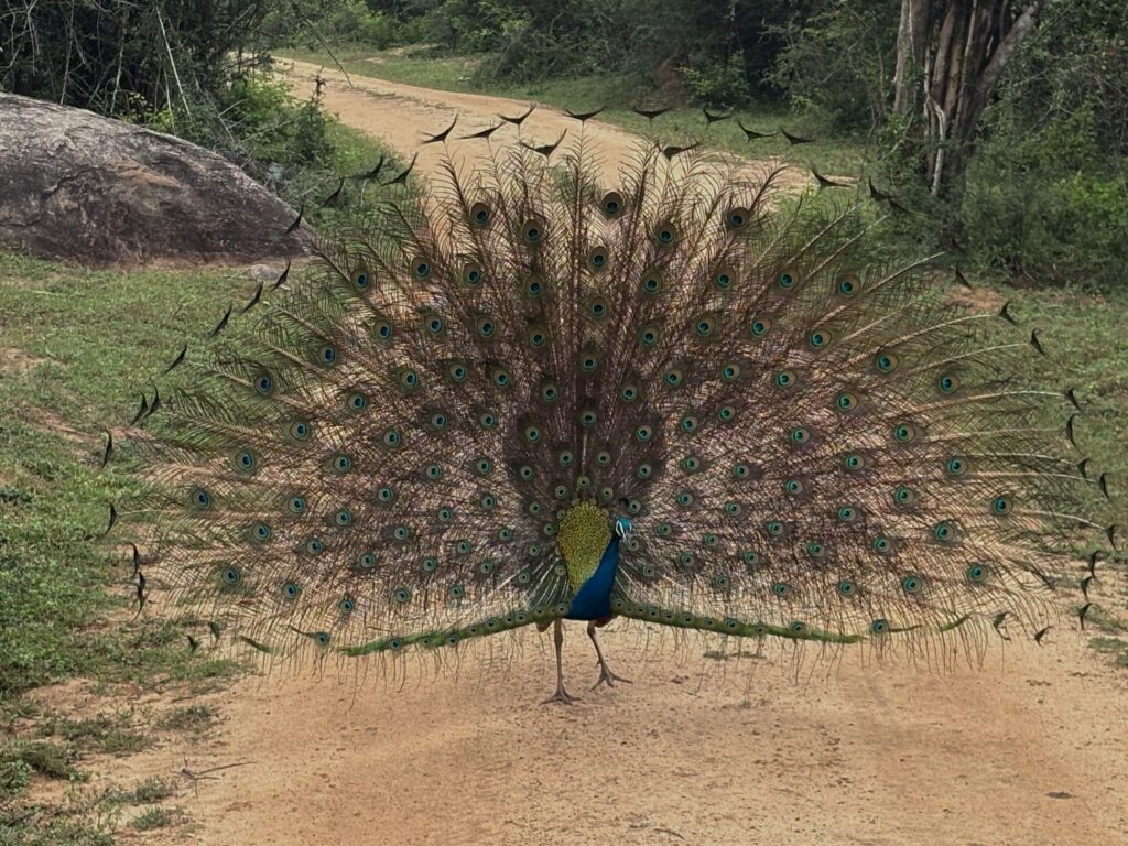Morning wake-up came much too early with a quick 4:15 a.m. tea before loading into our safari truck for a full-day safari in Yala National Park. After picking up another couple from the Netherlands, we were off to the park gates to await the 06:00 opening in a growing line of vehicles. As dawn broke, we entered the park and soon spotted a golden jackal, chital deer, and a glimpse of a baby elephant. Although the park was busy, the safari produced wildlife sightings every few minutes, including sambar deer, notable bird species such as fishing eagles and crested serpent eagles, two leopards, and a particularly bold elephant.