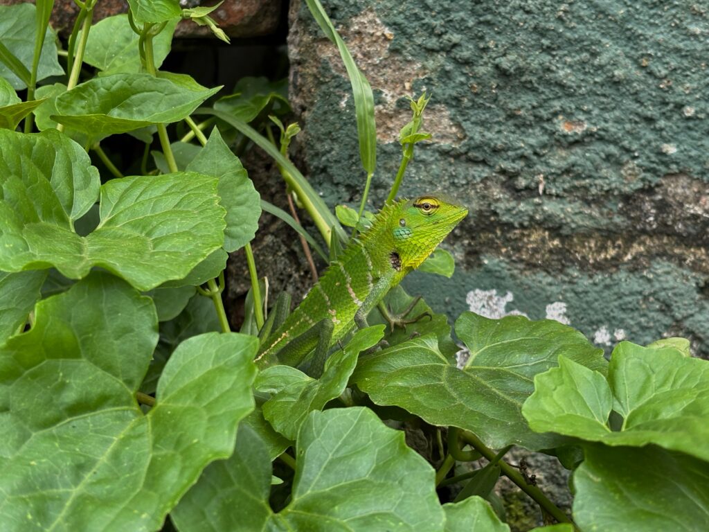 Common Green Forest lizard camouflaged near a garden wall