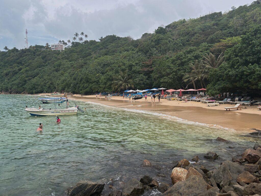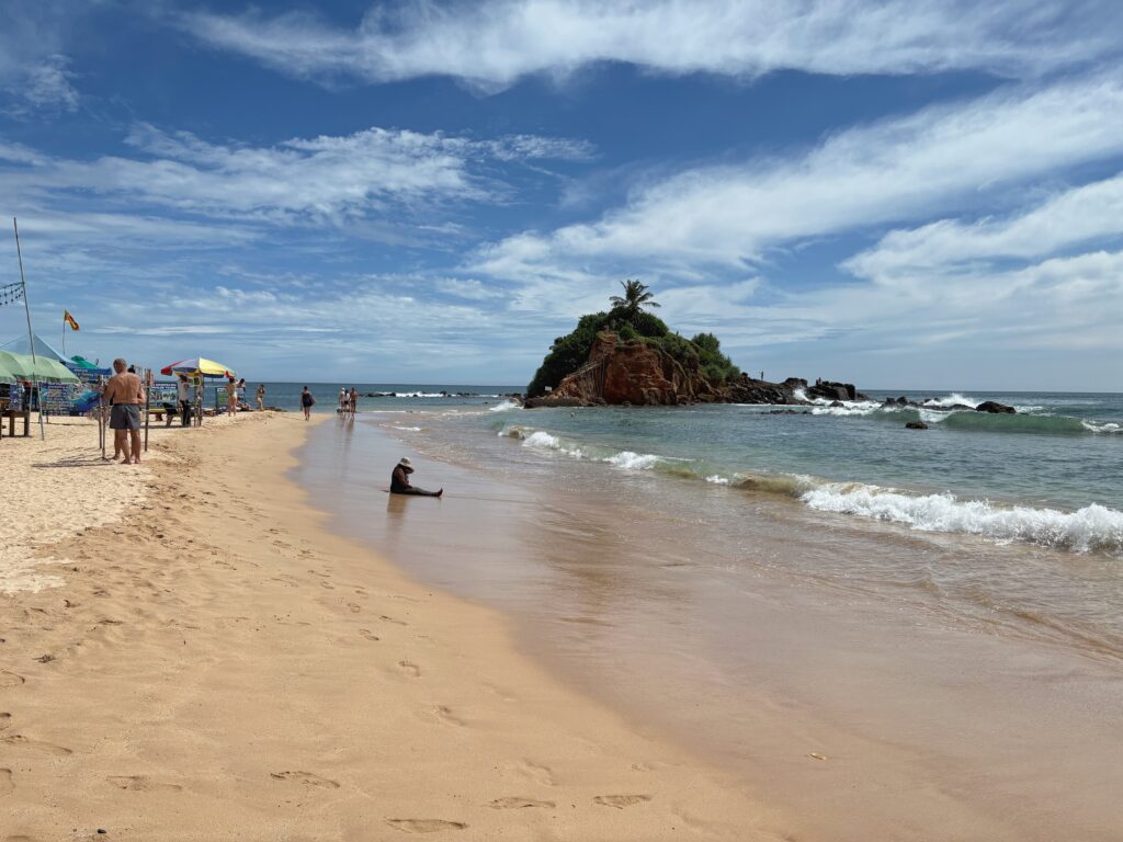 Unawatuna beach with the small rocky islet that I snorkeled out to in the distance
