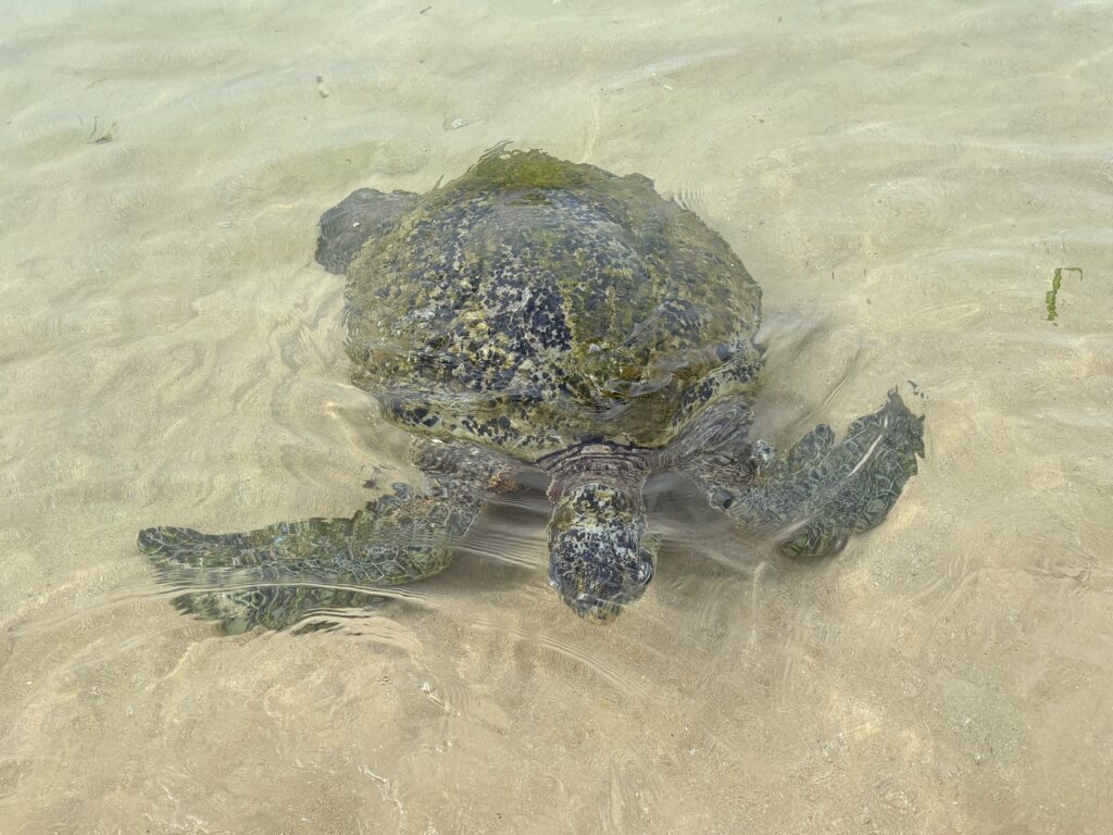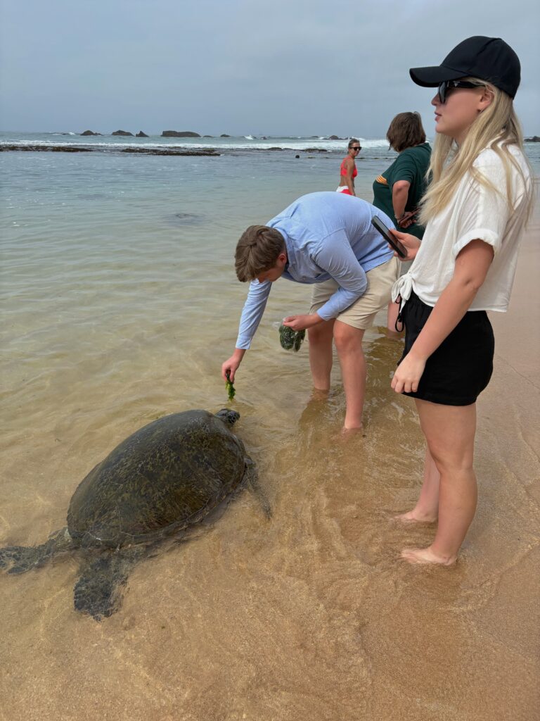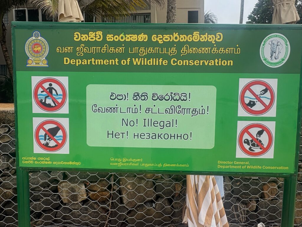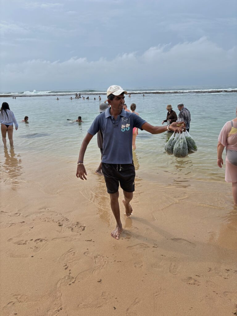 On our final morning, we rose early for one last beach outing, this time to Dalawella’s renowned sea turtle beach. Arriving before the crowds, we swam with and watched turtles grazing on the green seaweed in the shallow lagoon. Unfortunately, despite clearly posted prohibitions, some tourists were feeding and touching the turtles, encouraged by local vendors selling bags of sea lettuce. The vendors’ irritation at my photographing them suggested they were fully aware of the rules they were ignoring.